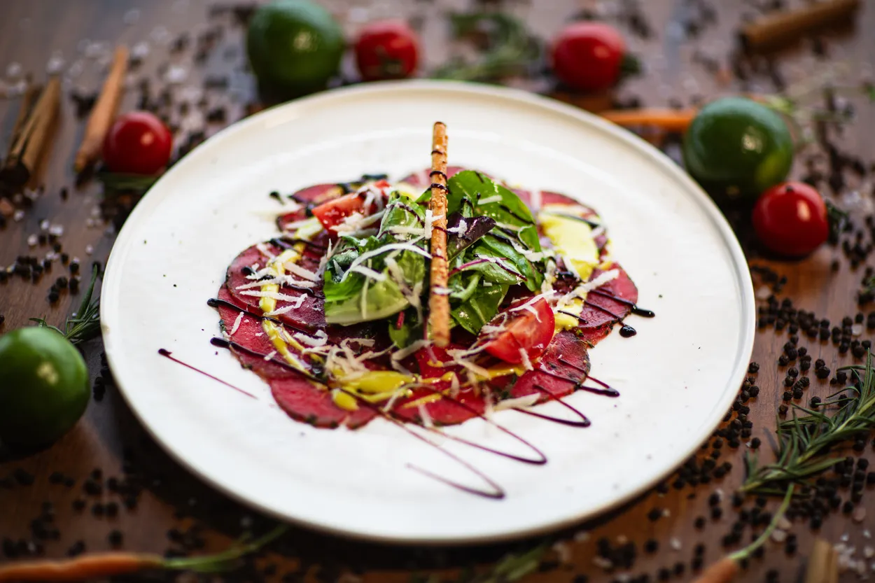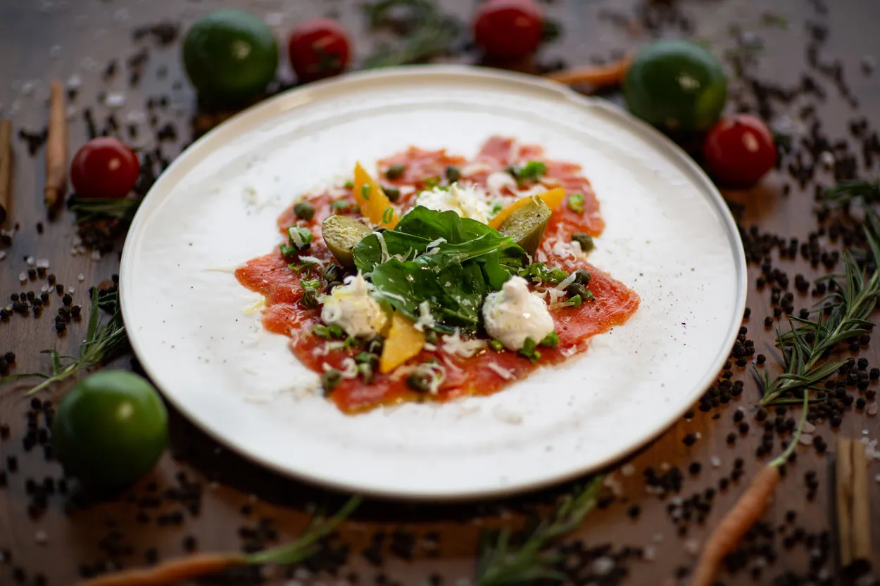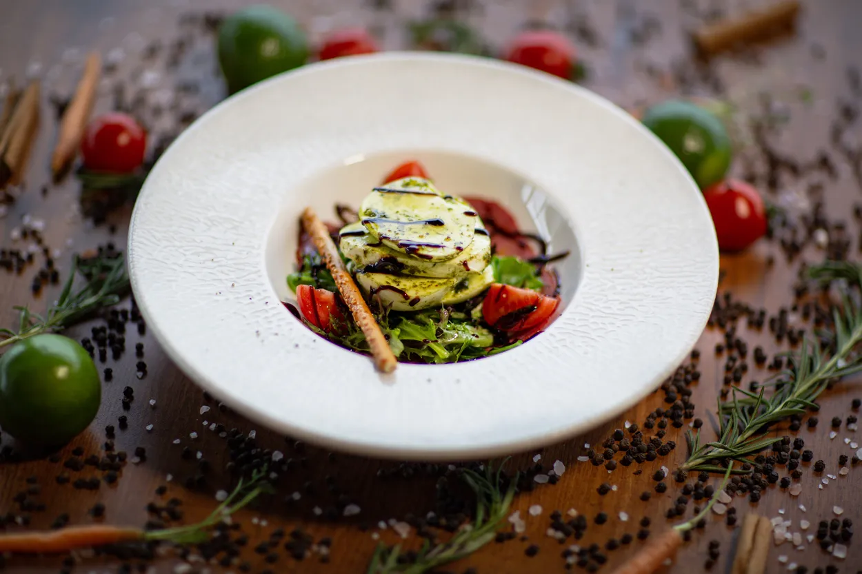 Suda mozerella peyniri, isli dana füme şık bir şekilde cherry domatesler, taze fesleğen,roka ve zeytinyağı ile tabağa yerleştirilir. Hafif tuz ve taze çekilmiş karabiberle lezzetlendirilir. / Burrata cheese, smoked veal, cherry tomatoes, fresh basil, rocket and olive oil. Lightly seasoned with salt and freshly ground black pepper.
