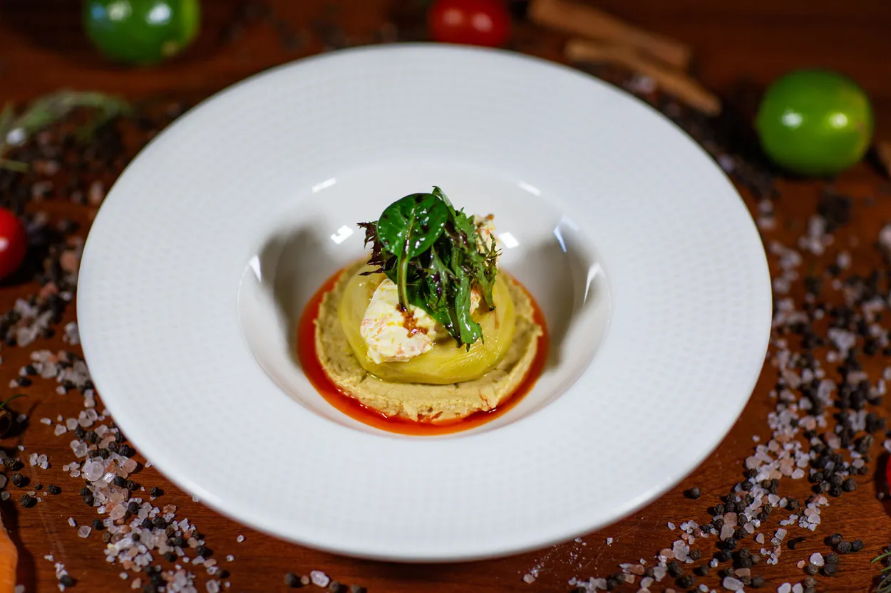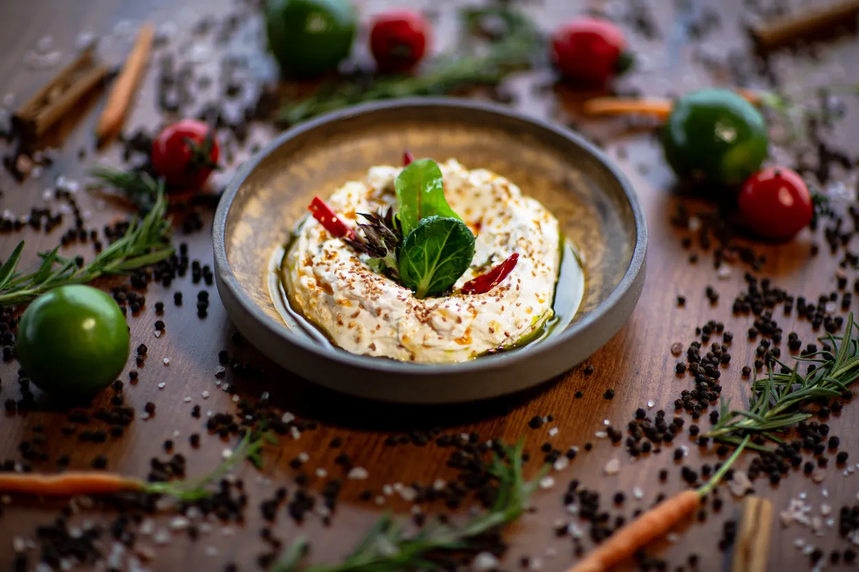 Humus, portakallı enginar, yoğurtlu kereviz, havuç, ve özel sosu ile. / Hummus, orange artichoke, celery with yoghurt, carrot and special sauce