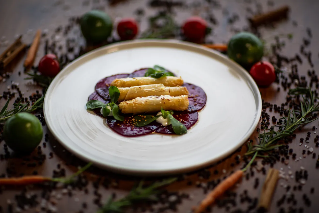 Fırınlanmış pancar dilimleri üzerinde çıtır baklava yufkada ezine peyniri, bal, kavrulmuş susam ve ekşi krema ile sunulmaktadır. / Baked beetroot slices topped with crispy baklava phyllo with pâté cheese, honey, roasted sesame seeds and sour cream.