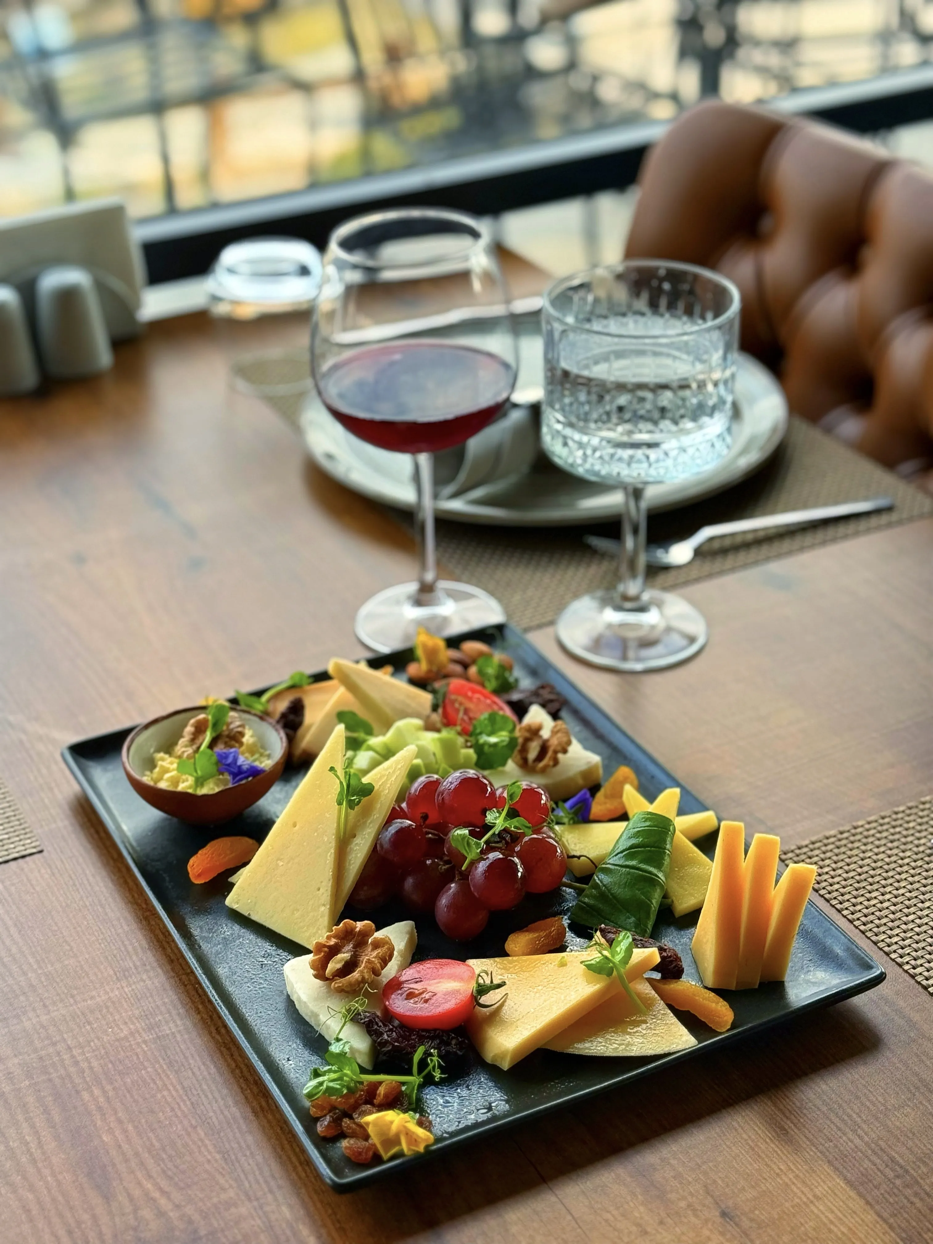 Edam peyniri, gouda peynir, rokfor peynir, eski kaşar, isli Çerkez, yöresel peynirler, yeşil elma ve Kapadokya asma yaprağı ile servis edilmektedir. / Served with Edam cheese, gouda cheese, roquefort cheese, old cheddar, sooty Circassian, local cheeses, green apple and Cappadocia vine leaves