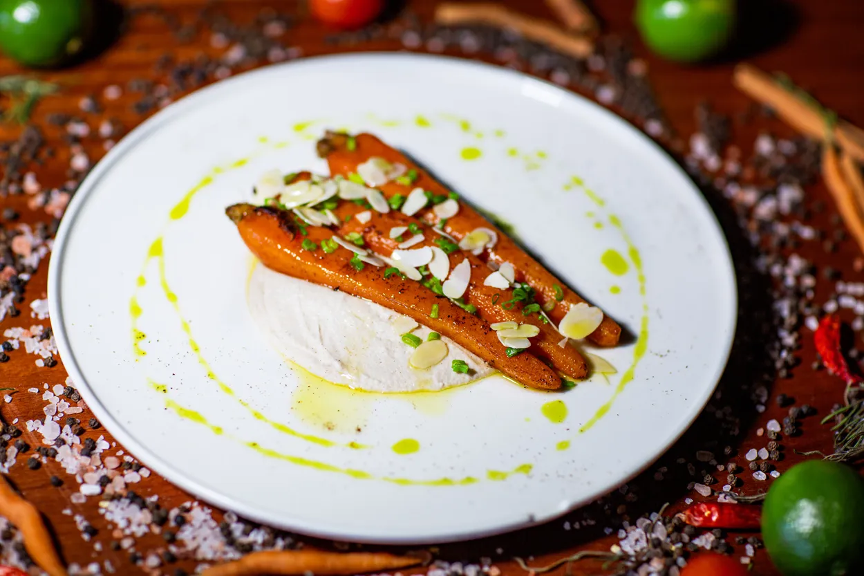 Külde havuç & kestaneli karnabahar püre, kavrulmuş file badem feslegen yağ. /
